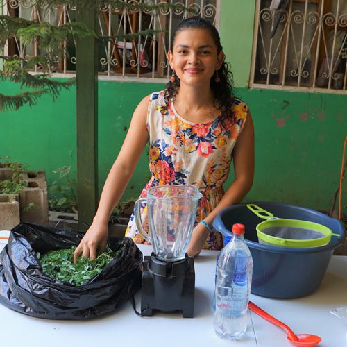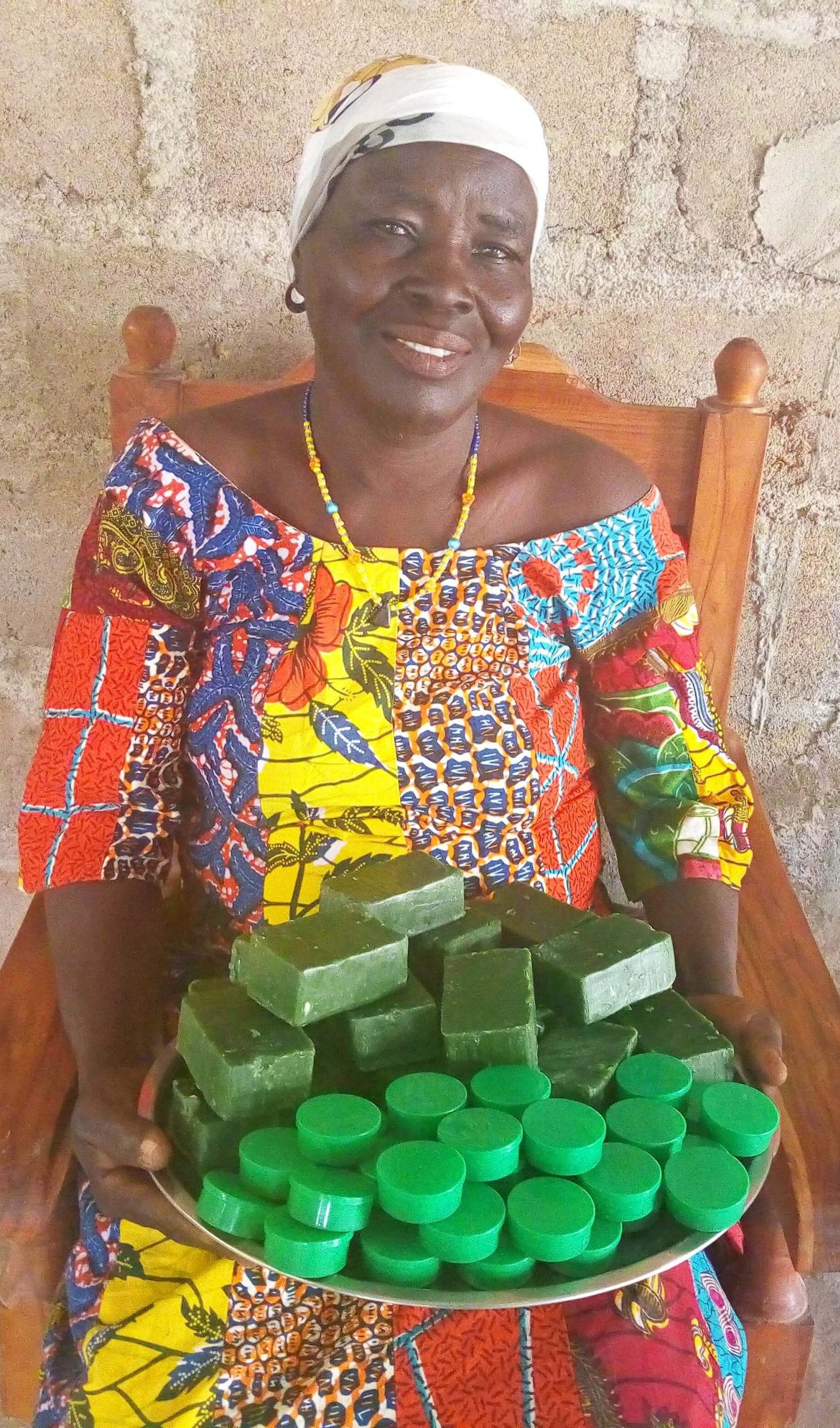 Above, a Peer Educator from Nassiegou shows moringa soap and ointment that the group made together.