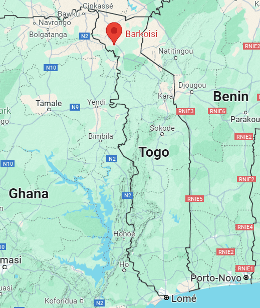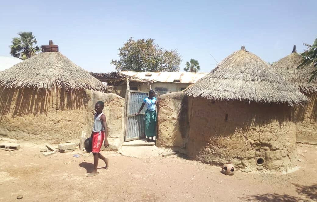 The map above has a red pin on the city nearest the village of Nassiegou. Below are the traditional round huts of Nassiegou with the metal-roofed church in the background.