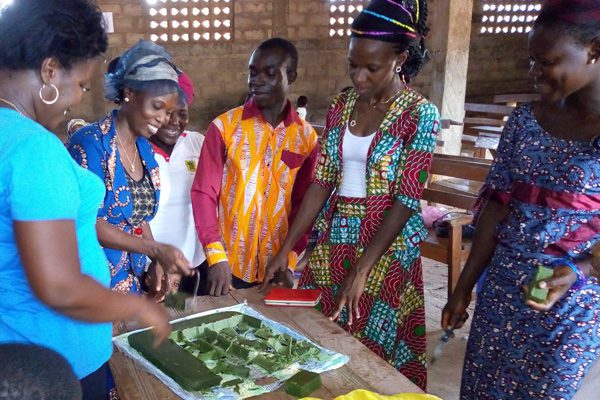 Jean and Olga, Strong Harvest’s Field Representatives in Togo, recently learned how to make soap using moringa leaves. Angelo, a local trainer in Togo, came to their home and spent two days teaching them everything they needed to know (first photo). They are now using this oil- and vitamin-rich soap in their own home to personally experience its benefits, as well as making batches to sell in their community.